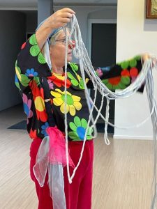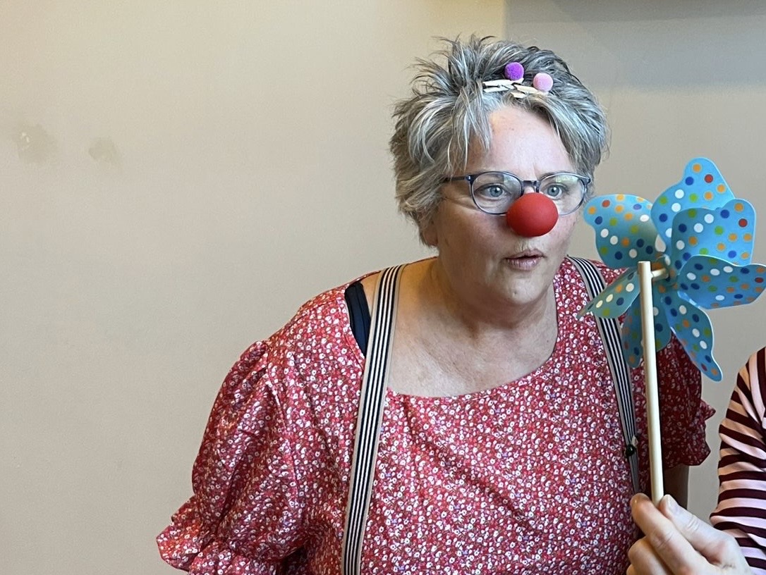Met een specialisatie in het benaderen van mensen met dementie of een verstandelijke beperking biedt Toet met haar rode neus en vrolijke kleding een sleepje en toegankelijke ingang om makkelijk in contact te treden.